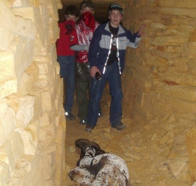 Эта фотография сделана в одесских катакомбах. В 2005 году компания молодых людей решила справить здесь новый год - и в разгар праздника один из них потерялся. Поиски в кромешной тьме не дали результата. Тело было обнаружено лишь много месяцев спустя. На фото - момент, когда пропавший был, наконец, обнаружен.