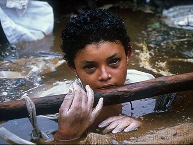 Черные глаза, смуглое лицо - и безжизненные распухшие руки... Девочка на фото выглядит пугающе - даже если не знать страшной правды. А она заключается в том, что жить этой девочке осталось считанные минуты. 13-летнюю Омайру Санчез из Колумбии засыпало обломками во время оползня, вызванного извержением вулкана. 60 часов она ждала спасения, будучи наполовину погруженной в воду. Спасатели слали отчаянные просьбы оставить к ним оборудование, необходимого для спасения девочки, но, в итоге, оно прибыло слишком поздно. В момент, когда сделан снимок, окружающие пытаются поддержать и утешить девочку, но, судя по ее глазам, она уже смирилась с судьбой.