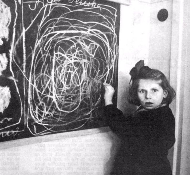 Обычные детские каракули, не так ли? Но что-то в них не так... Может, полное страха лицо девочки на снимке?.. ее имя - Терезка, она - бывшая заключенная концентрационного лагеря в Польше. Снимок сделан вскоре после ее освобождения. Девочку попросили нарисовать на доске дом - и вот что она изобразила в итоге. Как оказалась, девочка не помнила другого дома, кроме концлагеря, а ужасы, пережитые там, детская память изо всех сил постаралась скрыть, преобразив в бессмысленные каракули.