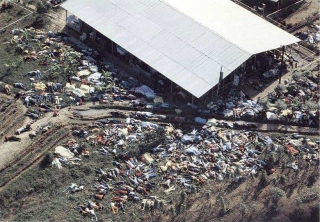 С первого взгляда фотография кажется заполненной мусором и обломками. Не сразу понимаешь, что все это - человеческие тела. На фото - вид сверху на Джонстаун, общину религиозной секты "Храм народов" в Гайане. 18 ноября 1978 года по призыву лидера общины Джима Джонса здесь покончили с собой 918 человек. Этот снимок стал одним из первых, запечатлевших чудовищную бойню в Джонстауне.