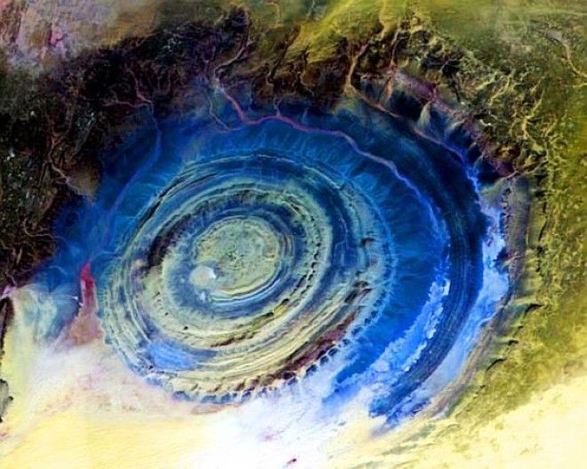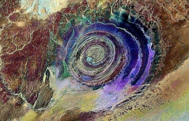 Это фото структуры Ришат сделано со спутника. Снимок был сделан на радиометре ASTER 7, необыкновенные цвета возникают в результате тепловой эмиссии. Структура была сформирована постепенно, кольцо за кольцом. Множество туристических агенств предлагает сафари в этой местности.