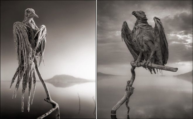 Кстати, впервые уникальную «способность» Натрона убивать животных и превращать их в статуи обнаружил фотограф Ник Брандт во время своего очередного путешествия по Африке. Он сделал репортаж, расположив останки так, будто эти птицы и летучие мыши живы, что сделало его кадры похожими на сцены из фильма ужасов.