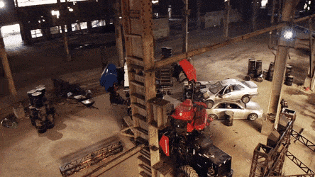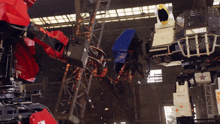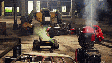 Второй раунд был "рукопашным". Операторы роботов использовали дымовые шашки, дроны, пушки и даже расставленные на арене автомобили и металлические конструкции.