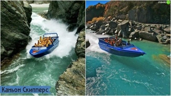 Скипперс-Каньон находится недалеко от Квинстауна. Ехать туда стоит. Поверьте, там очень красиво! Извилистая дорога была проложена в конце 19 века, по пути она встречает подвесной мост и поселения времен золотой лихорадки. Пройти каньон можно на джипе или на лодке, местами пригибаясь под выступами скал. Маршрут входит в список 25 самых красивых в мире.